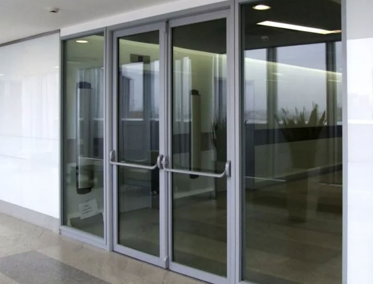 От качества заполнителя зависит, насколько эффективно преграда будет препятствовать распространению высоких температур. Материал должен быть негорючим и стойким к температурным воздействиям. В комплектацию противопожарной алюминиевой двери также входят уплотнители, ручки, замки и иные элементы фурнитуры. Дополнительные фурнитурные детали: доводчики, отбойные пластины, пороги разных типов.
